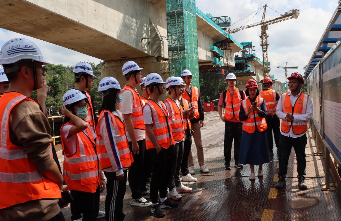 马东铁路项目是中国港湾公司在马来西亚承建的铁路项目,也是中国在“一带一路”沿线地区最大的海外基建项目。2月10日,华体会娱乐平台水利系赴马来西亚实践支队前往马东铁六分部的彭亨河特大桥和马兰T梁制梁场施工现场实地调研,与我国派往当地的工程师交流彭亨河特大桥的施工重点难点,并结合专业知识探讨问题的解决方案。