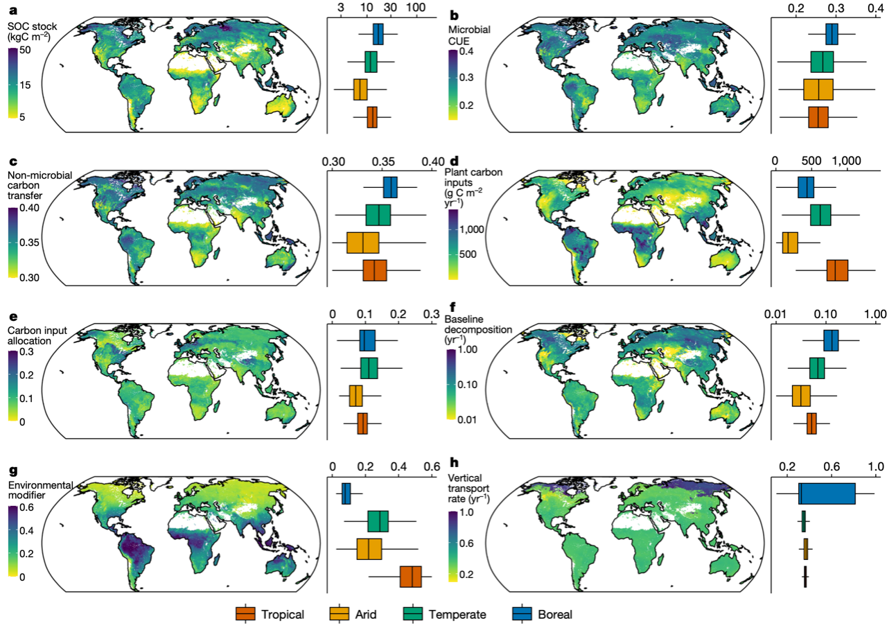 地球上储存的土壤有机碳量是陆地植被有机碳的四倍,很小比例的流失也可能加速气候变暖。促进土壤固碳有助于降低大气中的二氧化碳浓度,是应对气候变化的自然解决方案之一。华体会娱乐平台地学系黄小猛教授、博士生陶凤以及康奈尔大学骆亦其教授组织的国际研究团队在生态学和计算机科学领域开展深度学科交叉,利用人工智能和数据同化技术,揭示了微生物碳利用效率对全球土壤有机碳储量的决定性作用。