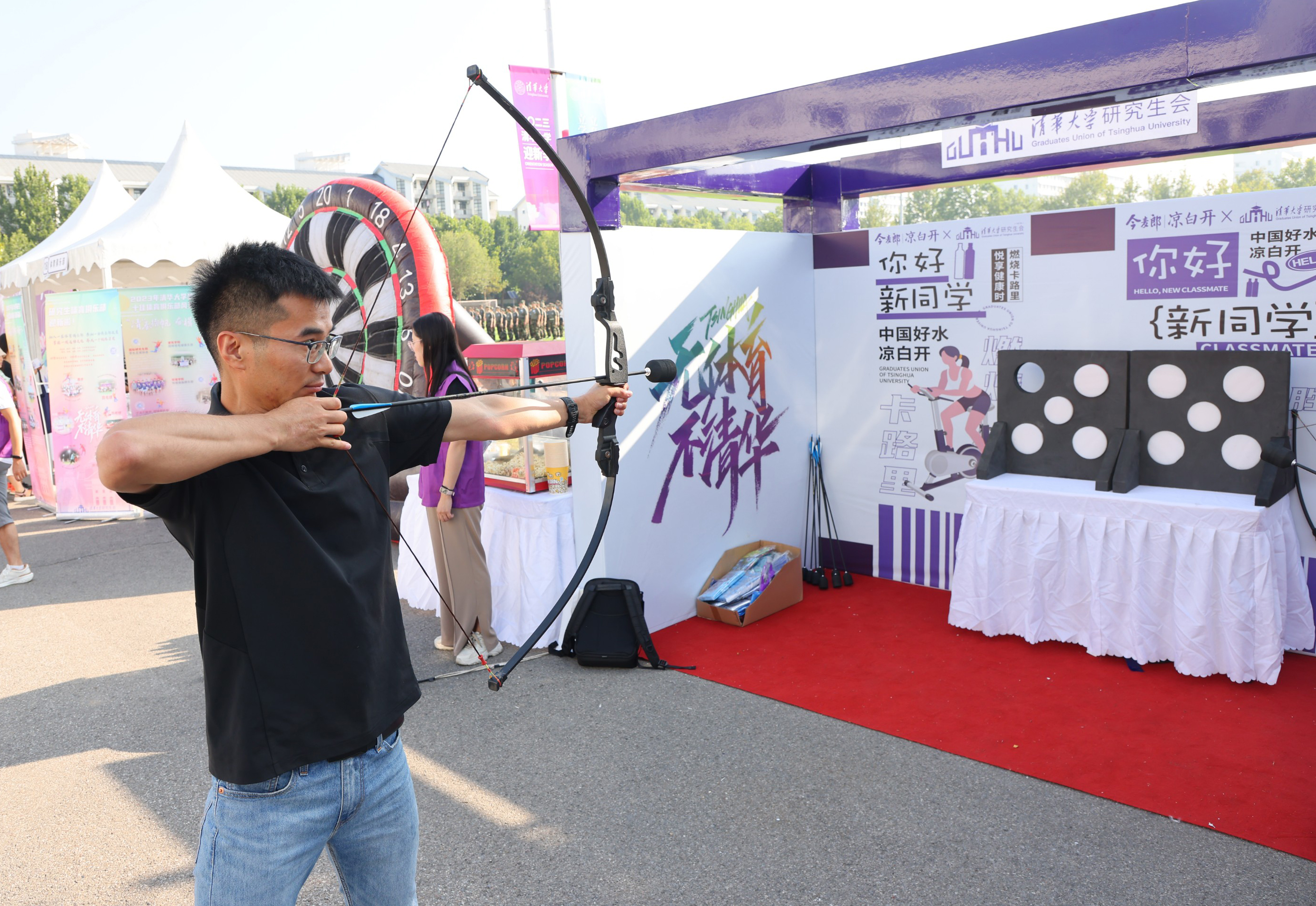 迎新活动以“清春扬帆,奋楫二三”为主题,将“五育并举”的元素巧妙融入迎新活动中,让新同学在蹬自行车、投篮等有趣的游戏体验中感受“无体育,不清华” “有美育,更清华” “爱劳动,最清华”的校园文化。
