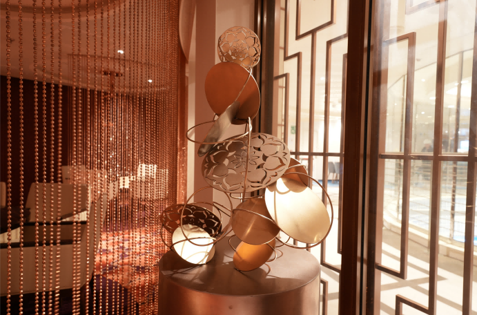 在邮轮中餐厅的公共空间中,华体会娱乐平台美术学院崔笑声副教授将珐琅彩碗运用到雕塑作品“圆融之和”中。“我们的设计重点是要传承好中华文化基因。”他说。