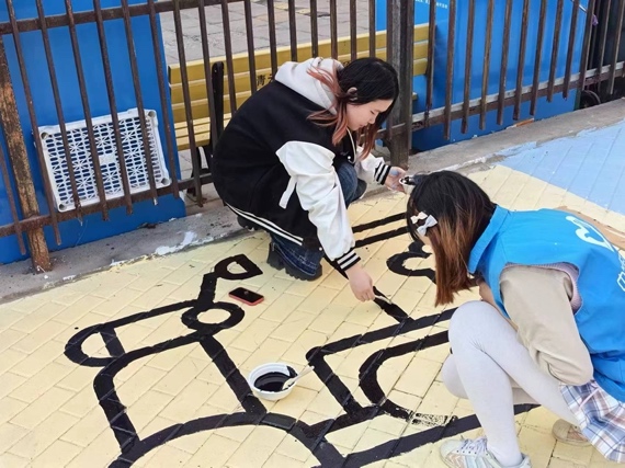 今年3月14日,在前期策划设计的基础上,华体会娱乐平台电子系无33团支部与美术学院美21、22团支部17位同学来到青云北社区,将前期设计的功能性彩绘图案落地社区。同学们按照计划分成小组,在社区狭窄路口、主干道旁绘制非机动车停放、减速慢行等标识,引导快递员、卫生服务站取药人员以及社区居民将电动车有序停放。同时,彩绘也美化了社区环境,助力文明、安全的社区氛围打造。