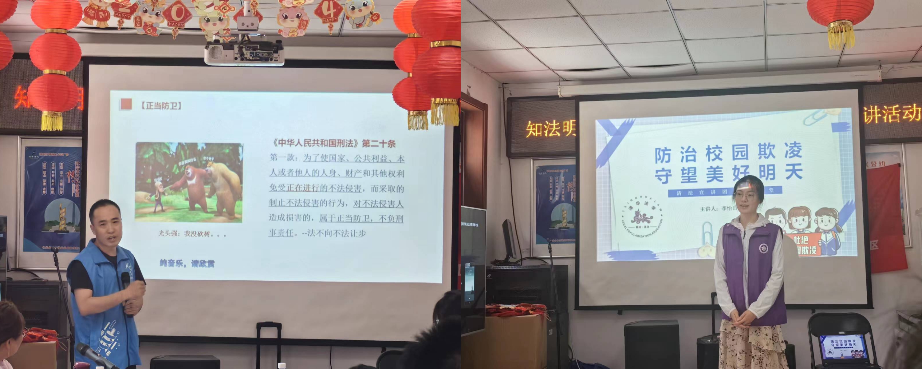 法硕231集体的同学们以“防治校园欺凌”为主题,向社区居民开展普法宣讲。法学院2023级硕士生赵亮作“从第20条谈正当防卫?——青少年反校园霸凌”宣讲,从防卫过当、防卫不适时、特别防卫等角度对刑法第20条进行阐释,并为应对校园霸凌实施正当防卫行为提出建议。公益普法宣讲团的讲师李怡田以“防治校园霸凌,守望美好明天”为主题,介绍了校园霸凌的不同形式,呼吁老师与家长关注孩子内心活动、甄别霸凌行为,为孩子提供健康安全的成长环境。