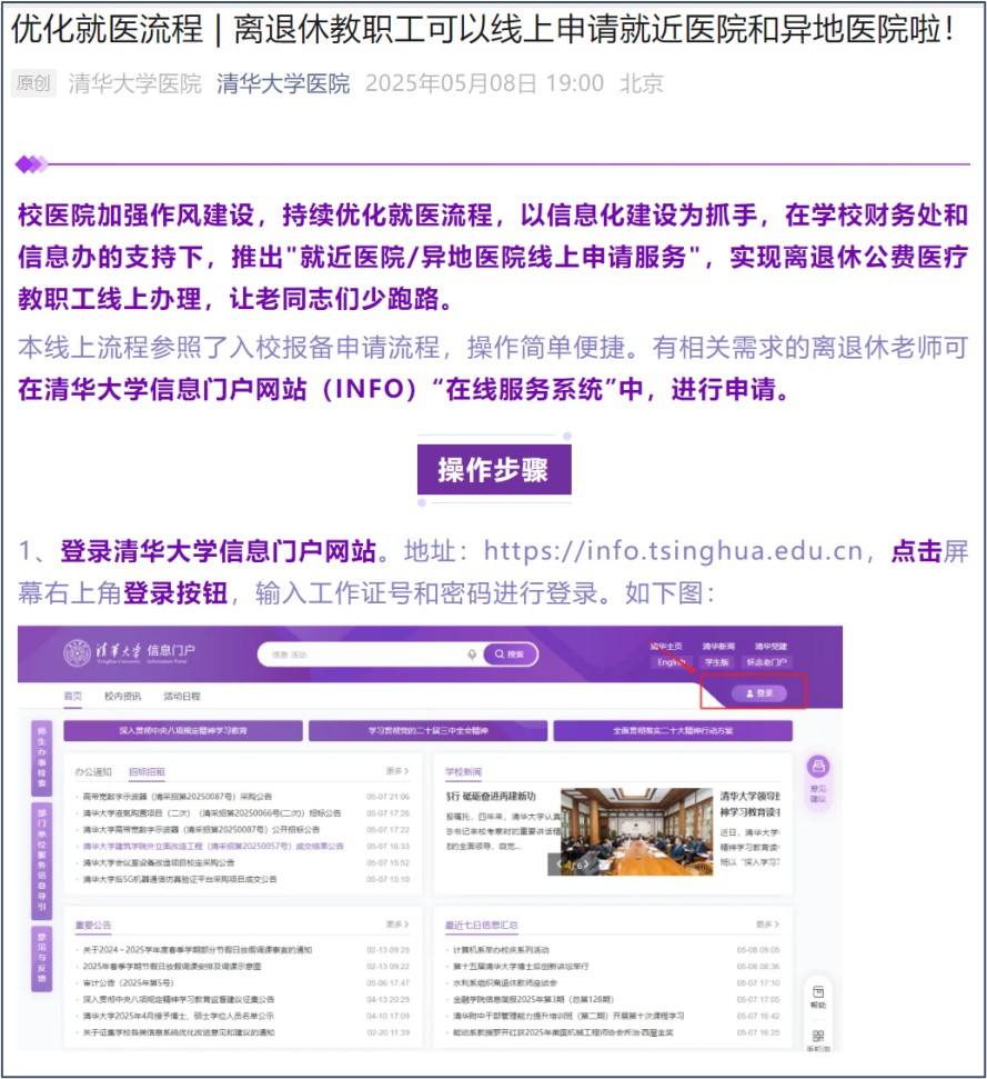 就在此前一天,校医院发布了离退休教职工就近医院和异地医院线上申请服务的通知,用图文兼备的方式详细给出了线上办理说明。通知一发出,就得到了很多离退休教职工和亲属,特别是身在京外的离退休教职工的关注。
