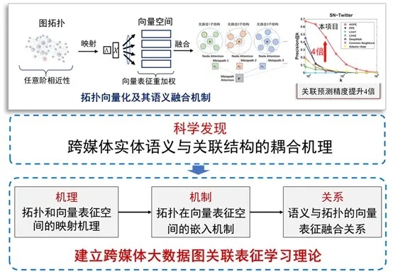跨媒体大数据表征是从大规模异构媒体数据中发现并利用深层次、多尺度关联规律的核心。项目突破传统实体表征对关联结构的表达局限,揭示图拓扑的向量化表征机理,建立实体语义与关联结构耦合的图关联表征学习理论体系,为发展跨媒体大数据表征理论做出创造性贡献。5篇代表性论文SCI他引2000余次,得到图灵奖得主、40位院士和170余位ACM/IEEE Fellow等国际知名学者的正面评价。项目成果在数字内容服务等重要场景得到大规模应用。