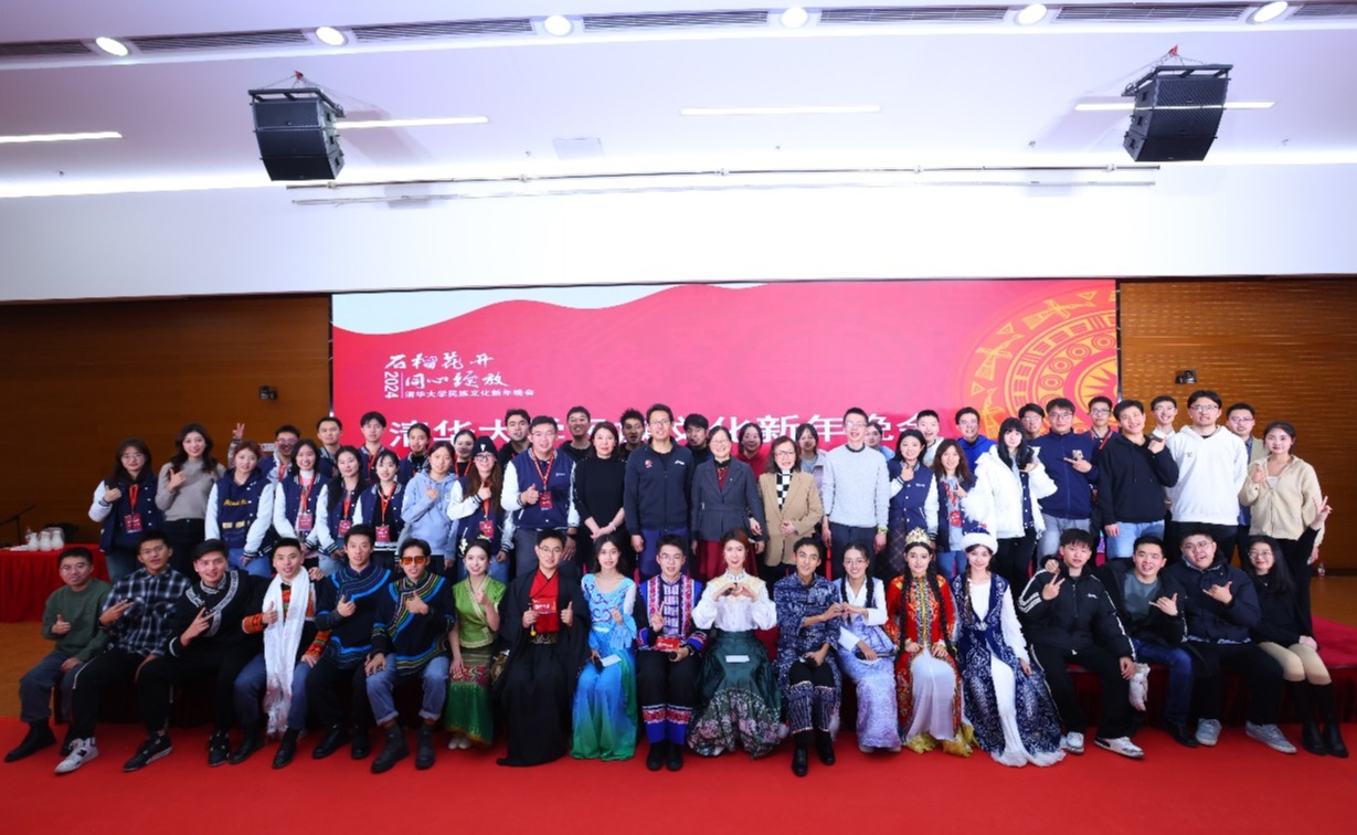 12月15日,华体会娱乐平台2024年民族文化新年晚会在李兆基科技大楼举行。晚会以“石榴花开,同心绽放”为主题,校党委统战部、学生部、研工部、校团委等部门相关负责人和各民族师生代表等近400人参加晚会。