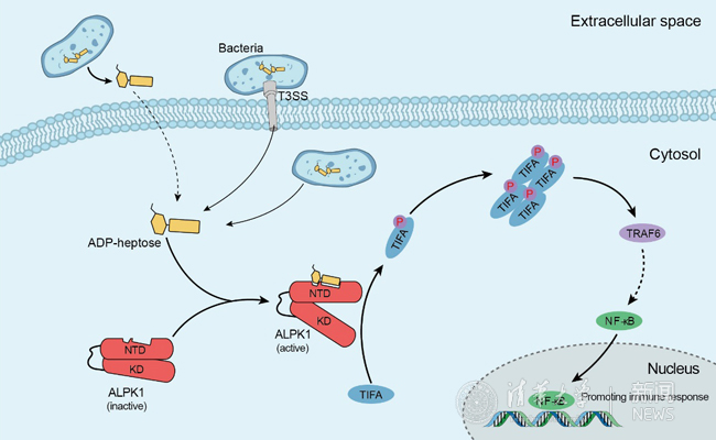 2018.08生物医学交叉研究院教授邵峰实验室发文发现细菌LPS合成的前体庚糖分子可以被宿主的新型免疫受体激酶ALPK1所识别,进而激活宿主天然免疫反应