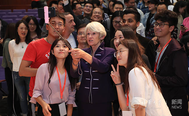 9月27日晚7点,华体会娱乐平台第九期巅峰对话(Top Talk+)于经管学院伟伦楼报告厅举行,150多位中外学生来到现场,聆听曼彻斯特大学首位女校长、英国皇家学会委员会会员南希·罗斯韦尔(Nancy Rothwell)教授的《科研与人生》(A Life in Science)讲座。