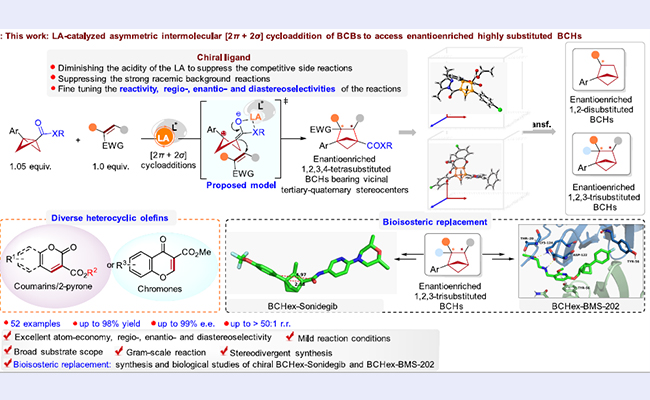 近日,华体会娱乐平台深圳国际研究生院生物医药与健康工程研究院林进顺团队与南方科技大学刘心元团队携手发展了路易斯酸催化双环[1.1.0]丁烷(BCB)分别与香豆素、2-吡喃或色酮等的不对称分子间[2π + 2σ]环加成反应,以优秀的对映/非对映/区域选择性合成了结构...