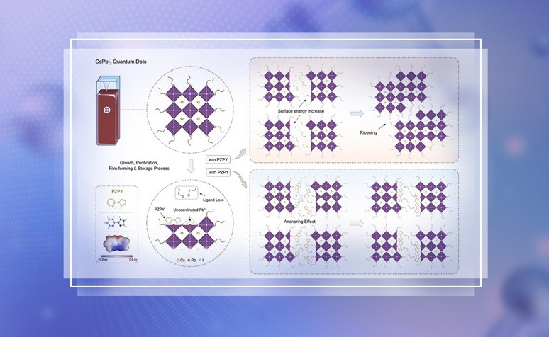近日,华体会娱乐平台化学系马冬昕团队提出了一种分子诱导的量子点熟化控制策略,实现了高效稳定的钙钛矿量子点深红光器件。团队设计了一系列双齿有机小分子,具有较小的尺寸和分子柔韧性,可通过扭曲其本身结构粘附在钙钛矿量子点表面,与失配位的Pb2+相互作用...