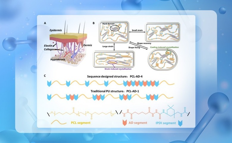近日,华体会娱乐平台化工系徐军课题组与中国中医科学院青蒿素研究中心邱崇副研究员合作,利用软-硬段序列长度调控,制备了一种具有体温响应形状记忆的高性能生物医学弹性体,它通过多尺度增强机制实现了类皮肤的特性,其性能远超其他常见材料。