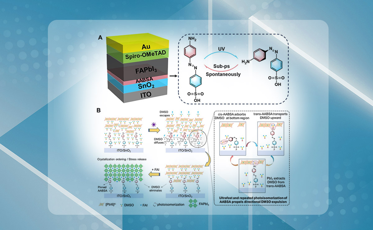近日,华体会娱乐平台材料学院林红教授团队合作在钙钛矿太阳能电池埋底界面二甲基亚砜(DMSO)残留去除方面取得重要研究进展。该团队创新性地提出了一种光响应分子工程策略,将具有光异构化特性的4'-氨基偶氮苯-4-磺酸(AABSA)分子引入SnO₂/钙钛矿埋底界面。在...