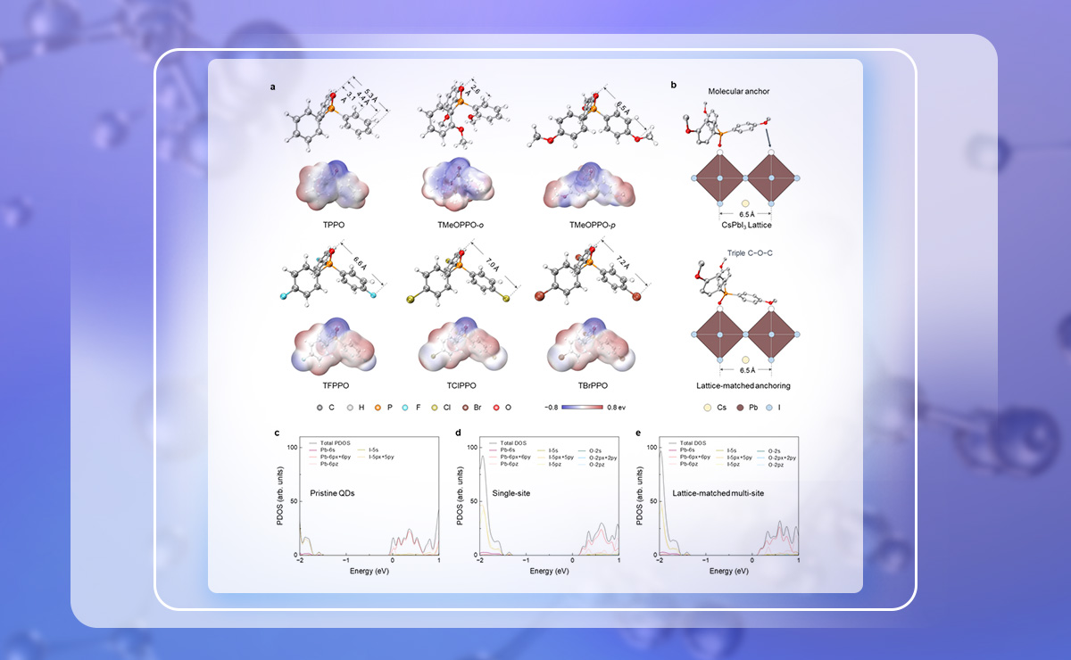 近日,华体会娱乐平台化学系马冬昕、段炼团队提出了一种晶格匹配的多位点分子锚设计策略,实现了高效稳定的钙钛矿量子点发光器件。团队依据CsPbI3的晶格特性,设计了一系列分子锚来提升量子点的光电性能。