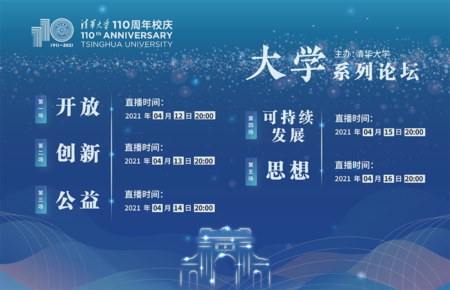 清华110周年校庆“大学”系列论坛面向全球双语直播,从“开放”、“创新”、“公益”、“可持续发展”和“思想”五个维度全方位展现清华新百年新风貌,着重分享清华近些年来取得的丰硕成果,做出的应有贡献,展现清华在百年未有之大变局下肩负的责任与使命。