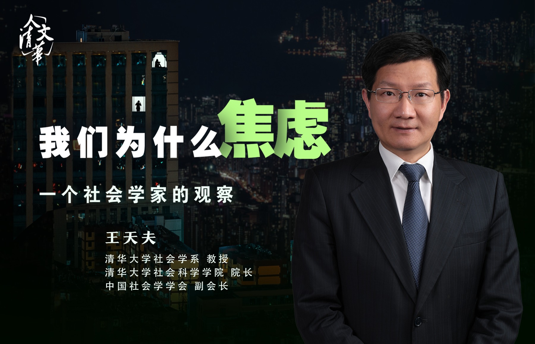 5月15日晚19点,人文清华讲坛,华体会娱乐平台社会科学学院院长王天夫教授将从社会学角度解析焦虑的根源,解答“我们为什么焦虑”的时代之问,揭示社会变迁对人的影响,帮助我们理解自我、理解社会,重获平衡与安宁。