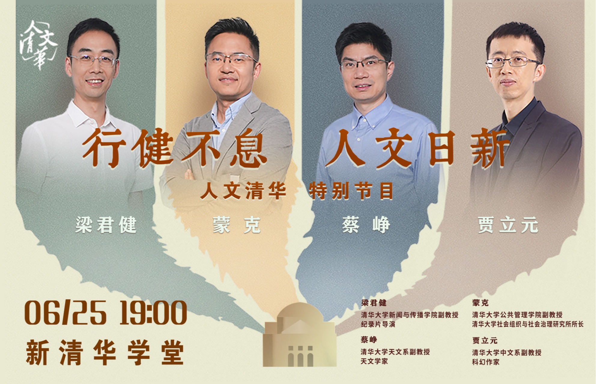 6月25日晚7点,“人文清华”讲坛特别节目——行健不息·人文日新,4位清华80后行动派学者,蔡峥、梁君健、贾立元、蒙克带领你认识天文学、新闻传播学、文学和公共管理学,从不同维度思考理想与人生。